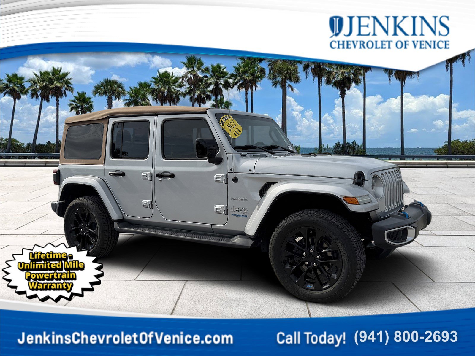 Mileage: 18,385 miles miles, Engine: 2.0L i-4, Transmission: Automatic, Drive Line: 4WD, Exterior Color: Silver Zynith, Interior Color: Dark Saddle/Black,Stock #: 1431333P1046, Comments: The price does not include tax, tag, license, an electronic filing fee of $449.00**, a private tag agency fee of $199.00**, and a predelivery service charge of $1199.00** **This charge represents costs and profit to the dealer for items such as inspecting, cleaning, and adjusting vehicles, as well as preparing documents related to the sale. * EPA-estimate metric: these are contingent on ideal conditions within a lab. Real-world situations such as carrying passengers or cargo, using climate control, driving style, and ambient temperatures can affect actual metrics. CALL OR TEXT 941-451-5422 NOW FOR PROFESSIONAL SALES ASSISTANCE! ABS brakes, Alloy wheels, Automatic temperature control, Brake assist, Compass, Delay-off headlights, Electronic Stability Control, Emergency communication system: SiriusXM Guardian, Front Bucket Seats, Front dual zone A/C, Front fog lights, Front reading lights, Fully automatic headlights, Garage door transmitter, Heated door mirrors, Illuminated entry, Integrated roll-over protection, Leather steering wheel, Low tire pressure warning, Navigation System, Outside temperature display, ParkView Rear Back-Up Camera, Passenger door bin, Remote keyless entry, Sport Suspension, Steering wheel mounted audio controls, Telescoping steering wheel, Tilt steering wheel, Traction control, Trip computer, Voltmeter, Wheels: 20" x 8" Fully Painted Aluminum. Silver Zynith Clearcoat 2022 Jeep Wrangler Unlimited Sahara 4xe 4WD 8-Speed Automatic 2.0L I4 DOHC
